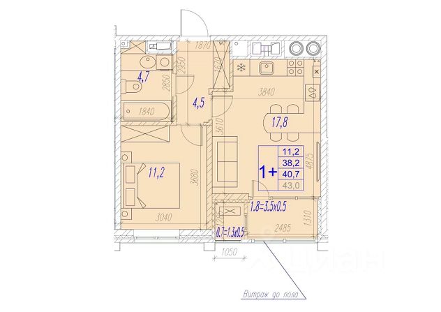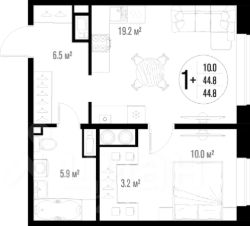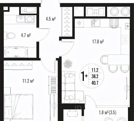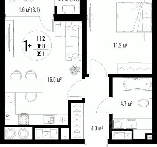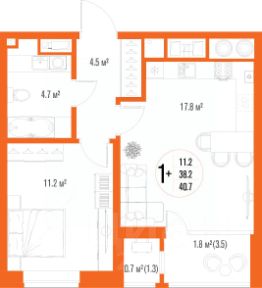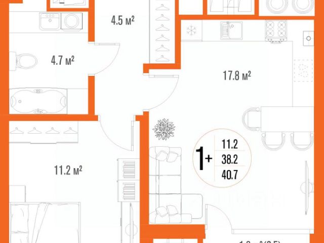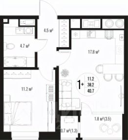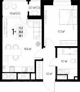 Квартира обладает площадью 39,4 квадратных метра и функциональной европланировкой, включающей кухню-гостинную, спальню и совмещенный просторный санузел.