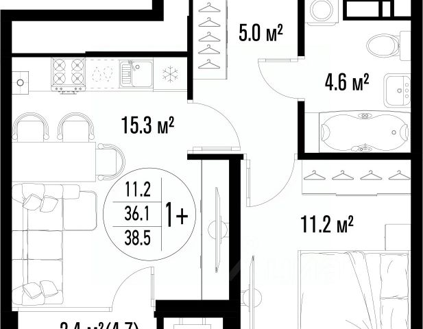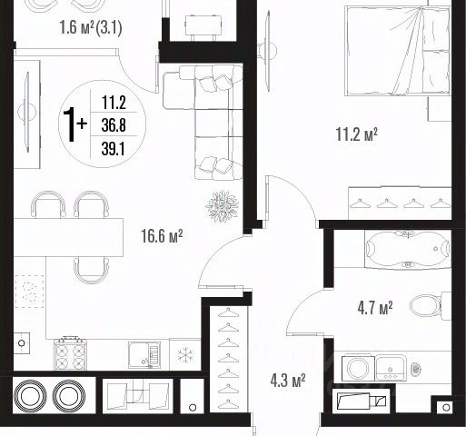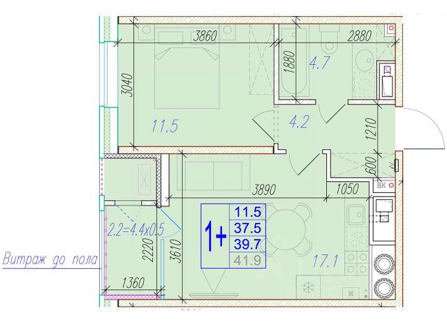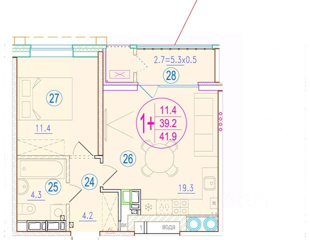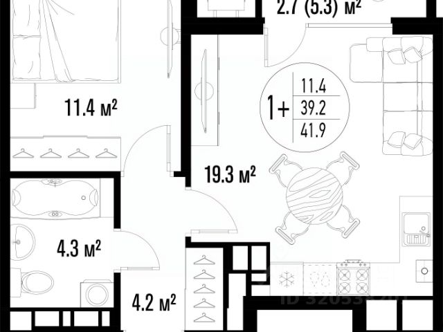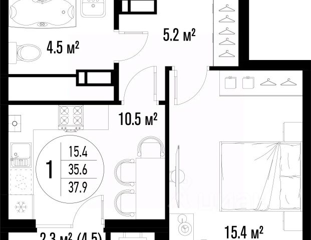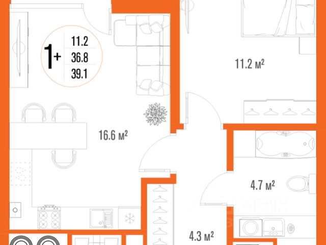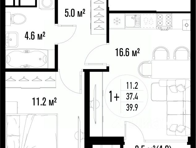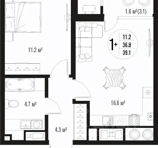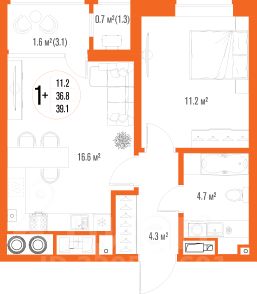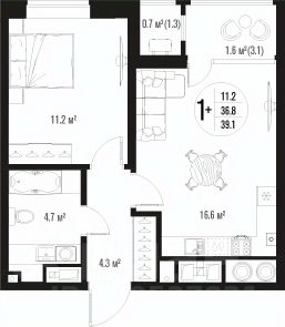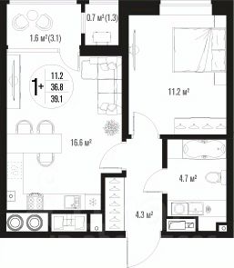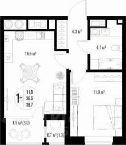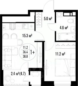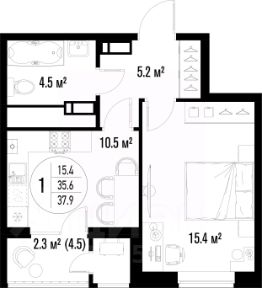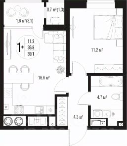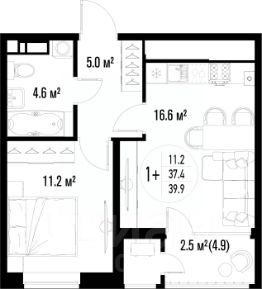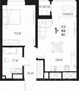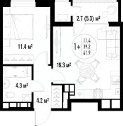 Квартира обладает площадью 39,4 квадратных метра и функциональной европланировкой, включающей кухню-гостинную, спальню и совмещенный просторный санузел.