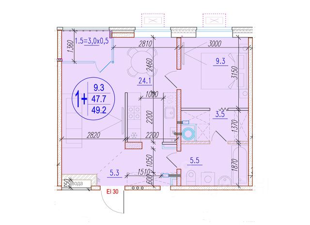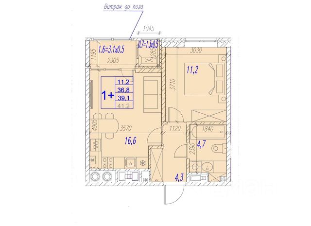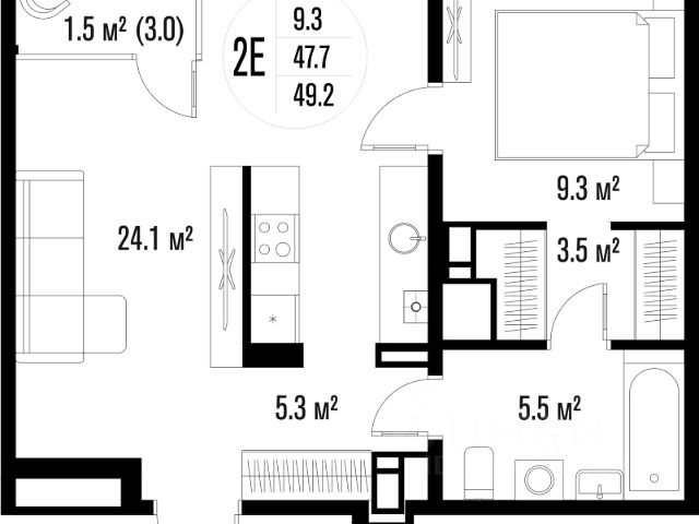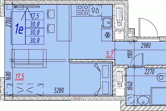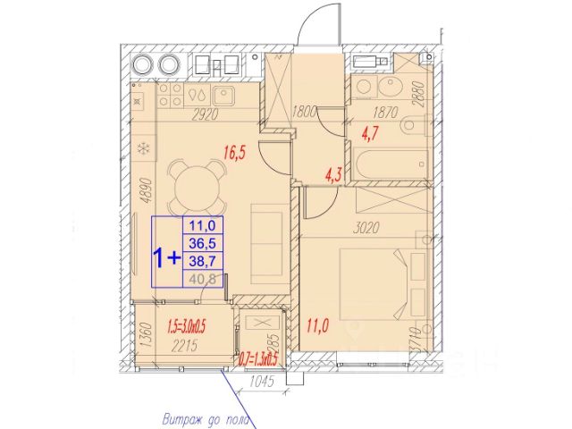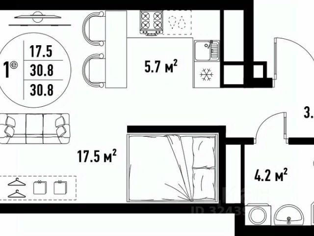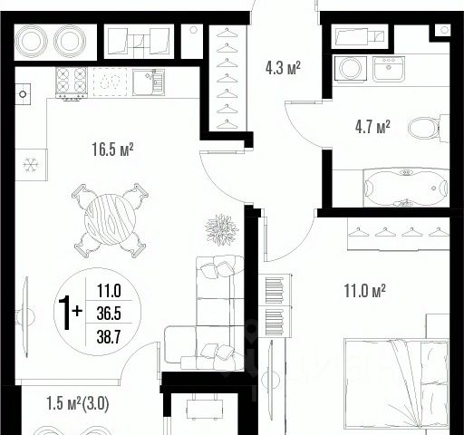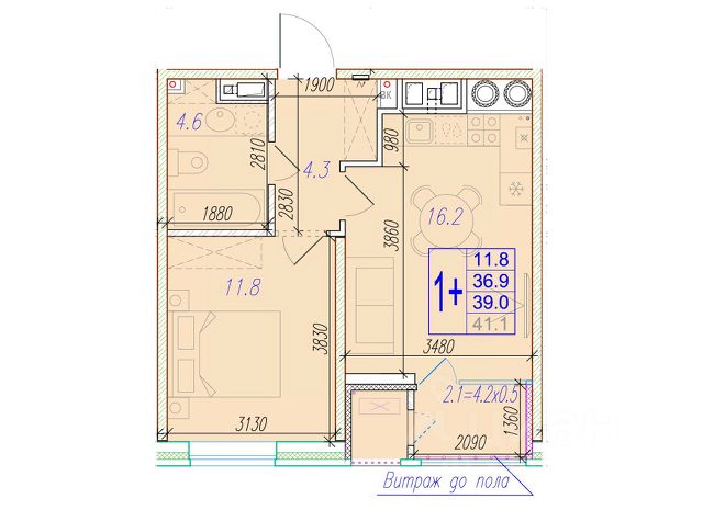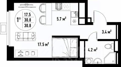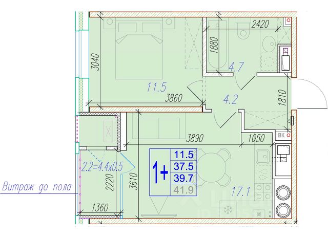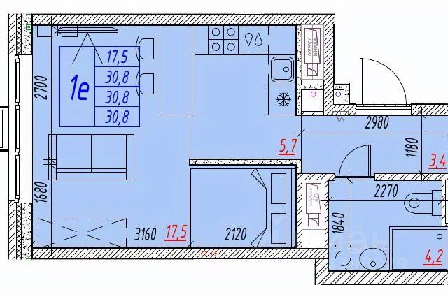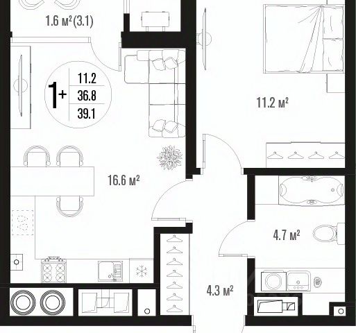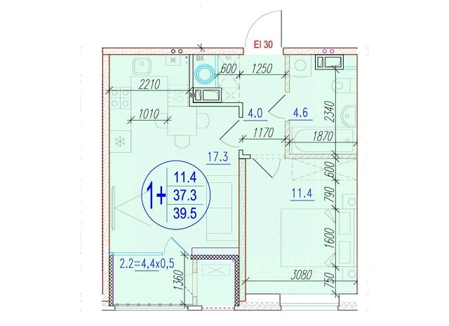 Квартира обладает площадью 39,4 квадратных метра и функциональной европланировкой, включающей кухню-гостинную, спальню и совмещенный просторный санузел.