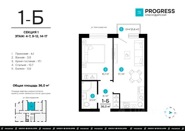 Продаётся 1-комнатная квартира в строящемся доме (Дом 1), срок сдачи: I-кв. 2028, общей площадью 35.96 кв.м., на 17 этаже. Новый жилой комплекс "Точка" от застройщика "Будущее" расположен по адресу: г. Астрахань, ул. Краснодарской, 43а