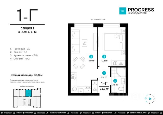 Продаётся 1-комнатная квартира в строящемся доме (Дом 1), срок сдачи: I-кв. 2028, общей площадью 33.33 кв.м., на 19 этаже. Новый жилой комплекс "Точка" от застройщика "Будущее" расположен по адресу: г. Астрахань, ул. Краснодарской, 43а