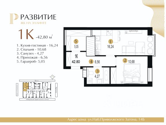 ЖК "РАЗВИТИЕ" — современный жилой комплекс класса Комфорт+ в центре города. Дом высотой 25 этажей расположен в престижной локации на Эллинге. В ЖК "РАЗВИТИЕ" уникальные видовые характеристики — из окон открываются панорамы на Приволжский затон, Волгу, Кремль и Храм Святого Владимира. Покупателям доступны 14 различных планировочных решений — от компактных студий площадью 23 м² до просторных 3-х комнатных квартир 75 м², с возможностью объединения квартир. Входные группы выполнены в формате дизайнерского лобби с четырёхметровыми потолками. Для удобства жителей предусмотрены: - консьерж-сервис, - кинозал, - детская игровая комната, - две велоколясочные, - гостевой санузел, - лапомойка для домашних животных. В доме установлено 7 современных лифтов и предусмотрено 46 кладовых помещений для хранения. Территория жилого комплекса полностью закрыта от посторонних и благоустроена: оборудованы детские и спортивные площадки, дорожка для скейтборда и велоспорта, зоны отдыха и прогулок.