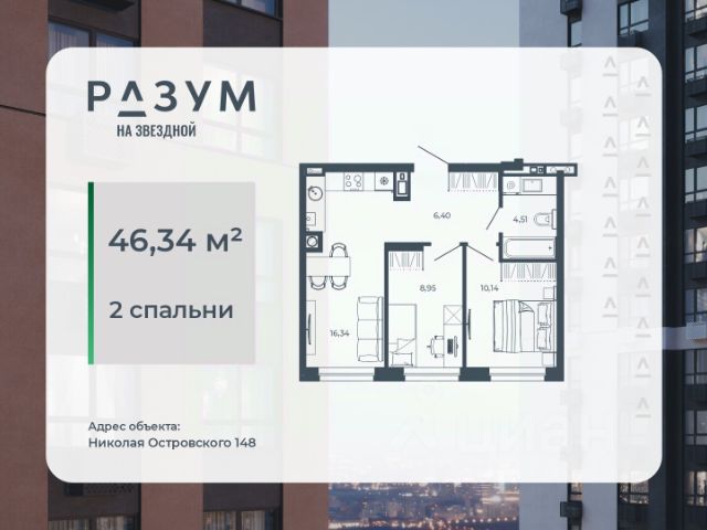 РАЗУМ на Звездной — высотный жилой комплекс компании РАЗУМ, создателя Сердце Каспия и Наследие. Здесь есть: развитый район, закрытая безопасная территория и транспортная доступность. Три 26-этажных дома расположены в границах ул. Звездной и Николая Островского. В пешей доступности: - 3 школы; - 4 государственных детских сада; - гипермаркет; - супермаркеты; - развивающие образовательные центры. РАЗУМ на Звездной — это: - 60 % озеленения в благоустройстве, детские игровые конструкции и зоны отдыха выполнены из экологичных материалов; - многоуровневое освещение территории с архитектурной подсветкой комплекса; - закрытая территория комплекса и видеонаблюдение по периметру и в холлах; - безбарьерная среда на территории жилого комплекса: удобство для велосипедистов, родителей с маленькими детьми и путешественников с большими чемоданами; - уютная зона ожидания с мягкой мебелью в холлах проекта и раздельные зоны под колясочные и велосипедные; - кладовые помещения на каждом этаже. В проекте РАЗУМ на Звездной представлено 13 планировочных решений от 21,08 м² до 63,39 м². Есть квартиры с предчистовой отделкой. В квартирах выровнены стены, выполнена полусухая стяжка пола, установлены радиаторы и трехконтурный газовый котел. В квартиру заведено электричество и установлена входная дверь.