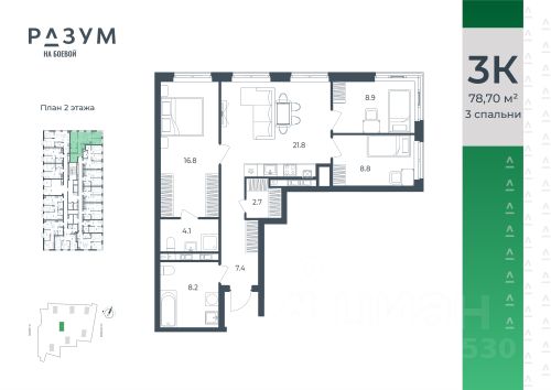 РАЗУМ на Боевой жилой комплекс компании РАЗУМ, создателя Сердце Каспия и Наследие. Проект из трех 18-этажных домов расположен в самом центре Советского района, на улице Боевая. В пешей доступности: - 3 школы; - 3 детских сада; - магазины; - автобусная остановка; Главная особенность проекта — угловое остекление, которое составляет 22% от всей площади. Все окна в квартирах находятся на высоте 62 см от пола, а на восемнадцатом этаже подоконник расположен всего в 42 см от пола. Во дворе-парке для детей создана своя развивающая среда, где каждый ребёнок может найти себе занятия и игры по душе. Здесь дети активно развиваются и познают окружающий мир. Игровые конструкции изготовлены из натуральных материалов, поэтому они не замерзают на морозе и не нагреваются на солнце. Необычные формы конструкций развивают образное мышление у детей и помогают им придумывать интересные и нестандартные игры. РАЗУМ на Боевой — это: - территория без машин; - безбарьерная среда; - единый эко-стиль в оформлении дворового пространства; - увеличенная площадь озеленения во дворе-парке; - многоуровневое освещение и подсветка фасадов; - видеонаблюдение; - эстетичные подъездные холлы; - колясочные и велосипедные зоны; - кладовые на каждом этаже. В проекте представлены 13 планировочных решений с площадью квартир от 21 м² до 62.2 м² с функциональным разделением на гостевую и приватные зоны.