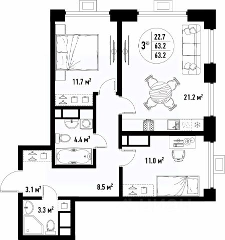 • Высота потолков 3 м, с учетом стяжки под напольное покрытие