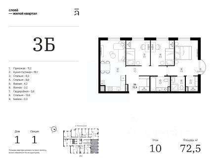 Квартира в классической планировке: кухня 12 м2, гостинная 18,4 м2, 2 спальни площадью 16,9 и 12,9 м2. Два больших санузла 5,2 м2 и 3,5 м2.