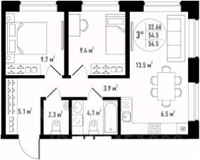 -комната - 13 кв.м., 9,7 кв.м., 16,8 кв.м.