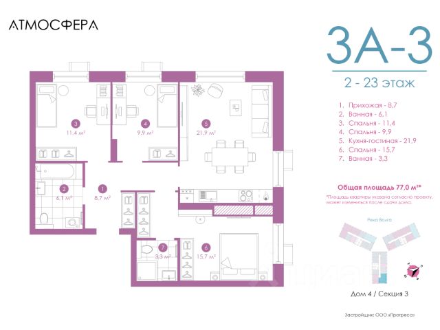Продажа от застройщика PROGRESS — дерзкий девелопер федерального уровня, одна из самых быстроразвивающихся компаний на российском рынке. Предвосхищает ваши ожидания с 2012 года. Каждый проект PROGRESS оригинален, отличается дизайном, архитектурой и ландшафтными решениями. Является обладателем Золотого знака "Надёжный застройщик России — 20202023". Комплекс обслуживает собственная сервисная компания "Среда". Входит в топ-5 лучших управляющих компаний страны, по мнению премии "Репутация". Живи в Атмосфере Жилой комплекс "Атмосфера" — уникальный проект линейки PRO MAX. Многоуровневая закрытая дворовая территория, авторская концепция холлов, сервис на уровне пятизвёздочного отеля. Уединённая локация между двумя водными пространствами — рекой Волгой и Приволжским затоном. На безопасной приватной дворовой территории ведётся круглосуточное видеонаблюдение. Для самых маленьких здесь оборудован детский игровой центр — кидс клаб, а для взрослых — премиальная кофейня с чарующим видом на Волгу. "Атмосфера" выводит понятие "комфорт" на совершенно иной уровень. Каждая деталь говорит о стремлении к совершенству. "Атмосфера" в цифрах: 4 дома с собственной уникальной и интерактивной дворовой территорией прямо на берегу реки Волги 1 приватный двор размером с городской парк 7 спортивных площадок 6 пространств для отдыха 5 детских площадок, включающих в себя интерактивный ручеёк и автодром 10 минут от исторической части города Почувствуй роскошный сервис • Собственная сервисная компания "Среда" поможет не беспокоиться о бытовых проблемах. • Персональное мобильное приложение "Среда", в котором можно просматривать новости и объявления, оплачивать коммунальные счета, получить доступ во двор и к камерам видеонаблюдения. • Консьерж-сервис. • Бесплатный wi-fi на всей территории комплекса. Квартира с предчистовой отделкой включает в себя: — Межквартирные стены, выровненные по маякам. — Межкомнатные стены из гипсовых пазогребневых плит, не требующие дополнительного выравнивания. — Откосы входной двери и оконных проёмов, реализованные и подготовленные к финишной отделке. — Напольное покрытие без стяжки. — Электрическая проводка по потолку. — Подводка инженерных коммуникаций к местам установки сантехнических приборов. Способы приобретения квартиры: С помощью материнского капитала В ипотеку Забронируйте квартиру по номеру телефона офиса продаж. Выведи свою жизнь на новый уровень. Живи в Атмосфере.