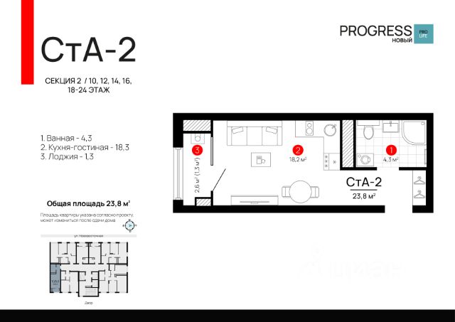РАЗУМ на Звездной — высотный жилой комплекс компании РАЗУМ, создателя Сердце Каспия и Наследие. Здесь есть: развитый район, закрытая безопасная территория и транспортная доступность. Три 26-этажных дома расположены в границах ул. Звездной и Николая Островского. В пешей доступности: - 3 школы; - 4 государственных детских сада; - гипермаркет; - супермаркеты; - развивающие образовательные центры. РАЗУМ на Звездной — это: - 60 % озеленения в благоустройстве, детские игровые конструкции и зоны отдыха выполнены из экологичных материалов; - многоуровневое освещение территории с архитектурной подсветкой комплекса; - закрытая территория комплекса и видеонаблюдение по периметру и в холлах; - безбарьерная среда на территории жилого комплекса: удобство для велосипедистов, родителей с маленькими детьми и путешественников с большими чемоданами; - уютная зона ожидания с мягкой мебелью в холлах проекта и раздельные зоны под колясочные и велосипедные; - кладовые помещения на каждом этаже. В проекте РАЗУМ на Звездной представлено 13 планировочных решений от 21,08 м² до 63,39 м². Есть квартиры с предчистовой отделкой. В квартирах выровнены стены, выполнена полусухая стяжка пола, установлены радиаторы и трехконтурный газовый котел. В квартиру заведено электричество и установлена входная дверь. Купить квартиру-студию до 18 млн. рублей в Астраханской области.