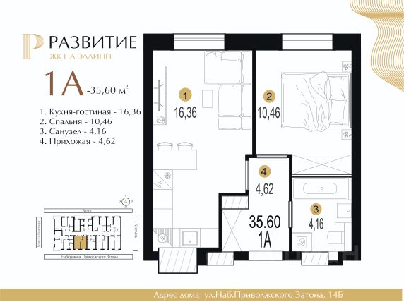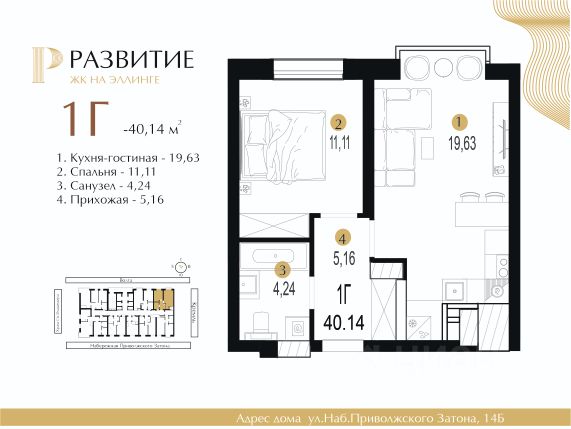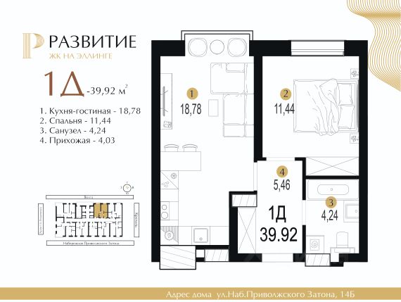 Продаётся 1-комнатная квартира в строящемся доме (Дом 2), срок сдачи: I-кв. 2026, общей площадью 40.57 кв.м., на 4 этаже.