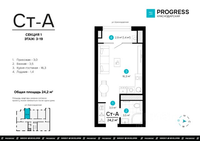 Эко-квартал "Калина Парк" — это новый эталон современного микрорайона. Жилой квартал "Калина Парк" — пространство с запоминающимся и узнаваемым архитектурным обликом, эргономичными планировками квартир, безопасными дворами и развитой, продуманной инфраструктурой. Квартал "Калина Парк" расположен в центральной части Астрахани на улице Калинина — все основные достопримечательности в шаговой доступности. Астраханский кремль и река Волга видны из окон квартир. При этом квартал буквально утопает в зелени и находится в тихом, уединенном районе. Дворы ЖК — это собственный парк, целый мир для прогулок и развлечений взрослых и детей. 10 преимуществ проекта "Калина Парк": • дом переменной этажности с фасадом из традиционного облицовочного кирпича; • выход в собственный парк; • разнообразные форматы квартир: от smart-планировок в 21,7 м² до просторных 3-комнатных квартир площадью 85,8 м²; • качественная предчистовая отделка white box; • гранд-лобби; • большая колясочная и "мойка" для лап вашего питомца после прогулок; • торговая галерея на 1 этаже; • приватный двор с игровыми комплексами, арт-объектами и бизнес-зоной; • подземный паркинг с возможностью круглосуточного видеонаблюдения; • кладовые для хранения сезонных и крупногабаритных вещей. Внимание! Ваши гости будут вам завидовать и захотят стать вашими соседями. Продается уютная 1-комнатная квартира евроформата в строящемся эко-квартале "Калина Парк". Квартира идеально подойдет как семье с детьми, так и семьям без детей. Общая площадь квартиры — 51,9 м². Жилая площадь составляет 23,4 м². Есть выход на просторную лоджию площадью 3,4 м². Её вы можете оборудовать как рабочий кабинет или пространство для отдыха. Комнату можно зонировать по своим предпочтениям, её площадь позволяет вместить всю необходимую мебель и атрибуты интерьера. Просторная светлая кухня-столовая площадью 17,4 м² станет любимым местом для приготовления и принятия пищи, встречи гостей и любимым местом всей семьи. Просторный совмещенный санузел площадью 5,1 м² позволяет уместить необходимую сантехнику и стиральную машину. Площадь прихожей 4,2 м². Для экономии пространства здесь можно установить встраиваемую мебель.