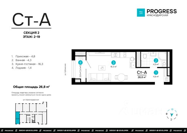 Продаётся студия в строящемся доме (Дом 1), срок сдачи: I-кв. 2028, общей площадью 27.5 кв.м., на 2 этаже. Новый жилой комплекс "Точка" от застройщика "Будущее" расположен по адресу: г. Астрахань, ул. Краснодарской, 43а