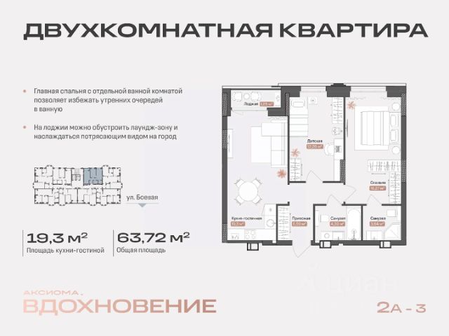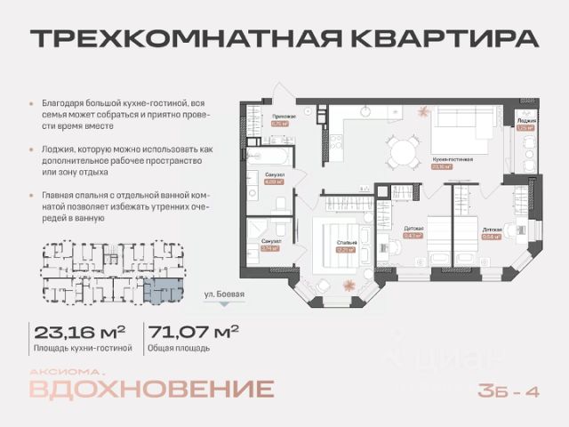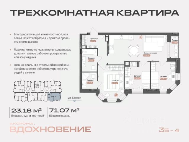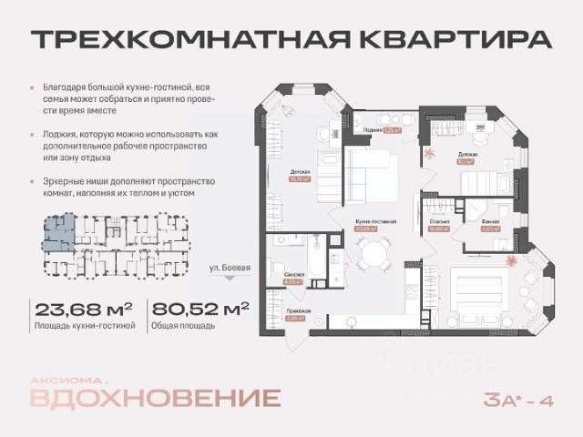 Продаётся 3-комнатная квартира в строящемся доме (Дом 50А), срок сдачи: IV-кв. 2027, общей площадью 80.52 кв.м., на 9 этаже. Новый жилой комплекс "Аксиома.Вдохновение" от застройщика "Аксиома" расположен по адресу: Астрахань, ул., Боевая, 50А