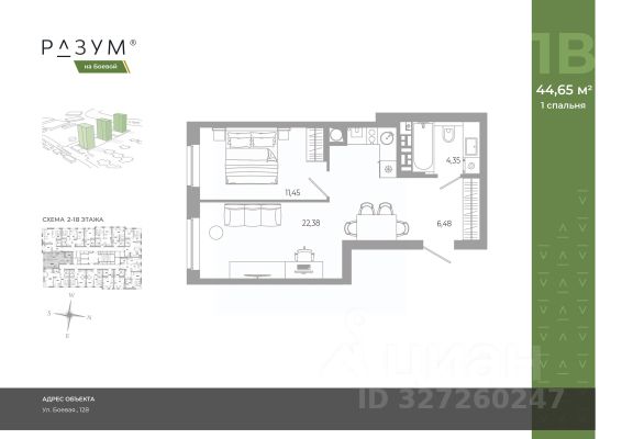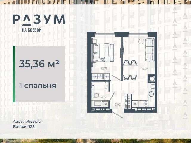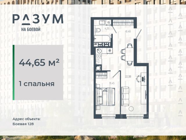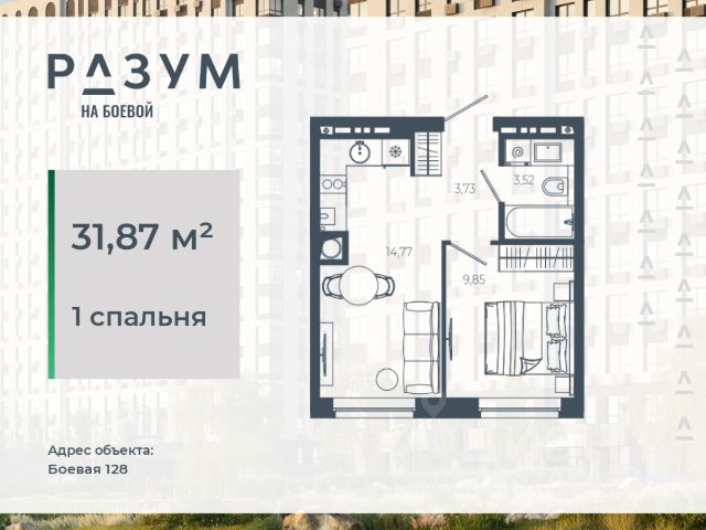 "РАЗУМ на Боевой" жилой комплекс компании "РАЗУМ", создателя "Сердце Каспия" и "Наследие". Проект из трех 18-этажных домов расположен в самом центре Советского района, на улице Боевая. В пешей доступности: - 3 школы; - 3 детских сада; - магазины; - автобусная остановка; Главная особенность проекта — угловое остекление, которое составляет 22% от всей площади. Все окна в квартирах находятся на высоте 62 см от пола, а на восемнадцатом этаже подоконник расположен всего в 42 см от пола. Во дворе-парке для детей создана своя развивающая среда, где каждый ребёнок может найти себе занятия и игры по душе. Здесь дети активно развиваются и познают окружающий мир. Игровые конструкции изготовлены из натуральных материалов, поэтому они не замерзают на морозе и не нагреваются на солнце. Необычные формы конструкций развивают образное мышление у детей и помогают им придумывать интересные и нестандартные игры. "РАЗУМ на Боевой" — это: - территория без машин; - безбарьерная среда; - единый эко-стиль в оформлении дворового пространства; - увеличенная площадь озеленения во дворе-парке; - многоуровневое освещение и подсветка фасадов; - видеонаблюдение; - эстетичные подъездные холлы; - колясочные и велосипедные зоны; - кладовые на каждом этаже. В проекте представлены 13 планировочных решений с площадью квартир от 21 м² до 62.2 м² с функциональным разделением на гостевую и приватные зоны.