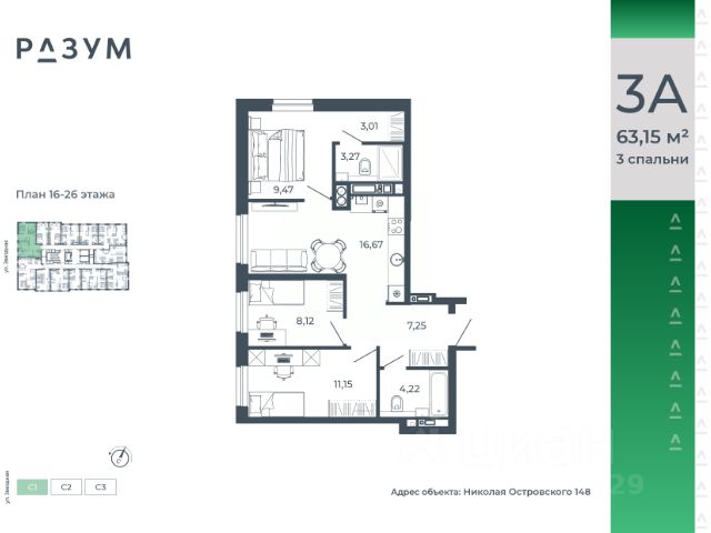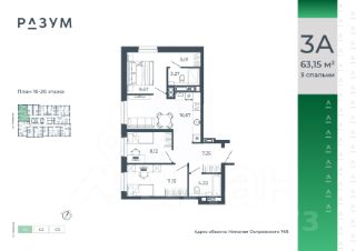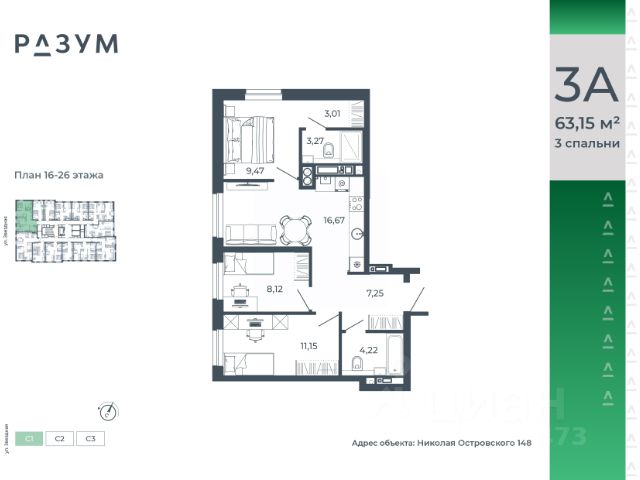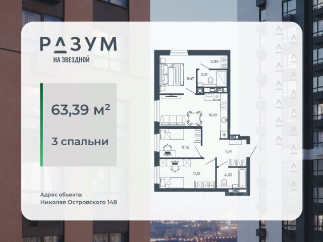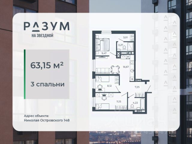 РАЗУМ на Звездной — высотный жилой комплекс компании РАЗУМ, создателя Сердце Каспия и Наследие. Здесь есть: развитый район, закрытая безопасная территория и транспортная доступность. Три 26-этажных дома расположены в границах ул. Звездной и Николая Островского. В пешей доступности: - 3 школы; - 4 государственных детских сада; - гипермаркет; - супермаркеты; - развивающие образовательные центры. РАЗУМ на Звездной — это: - 60 % озеленения в благоустройстве, детские игровые конструкции и зоны отдыха выполнены из экологичных материалов; - многоуровневое освещение территории с архитектурной подсветкой комплекса; - закрытая территория комплекса и видеонаблюдение по периметру и в холлах; - безбарьерная среда на территории жилого комплекса: удобство для велосипедистов, родителей с маленькими детьми и путешественников с большими чемоданами; - уютная зона ожидания с мягкой мебелью в холлах проекта и раздельные зоны под колясочные и велосипедные; - кладовые помещения на каждом этаже. В проекте РАЗУМ на Звездной представлено 13 планировочных решений от 21,08 м² до 63,39 м². Есть квартиры с предчистовой отделкой. В квартирах выровнены стены, выполнена полусухая стяжка пола, установлены радиаторы и трехконтурный газовый котел. В квартиру заведено электричество и установлена входная дверь.