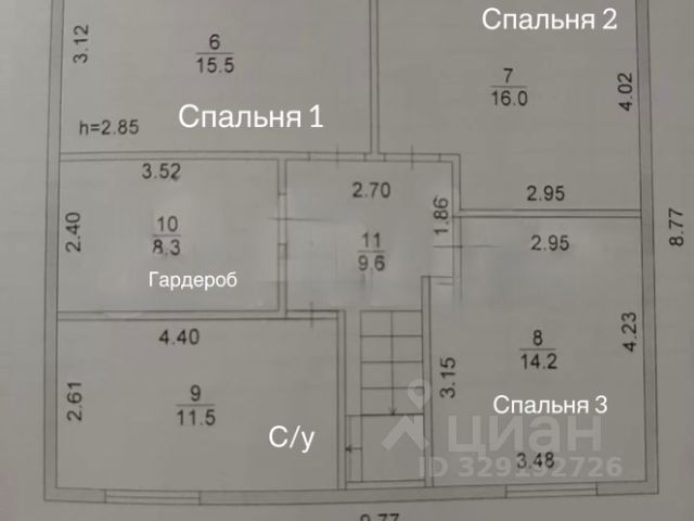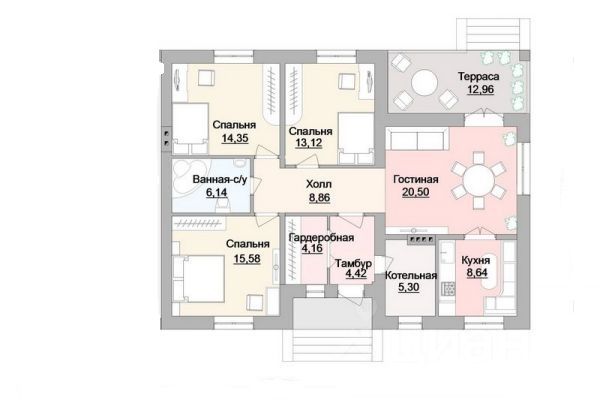 Второй этаж: три спальных комнаты разного метража, холл - гардеробная.