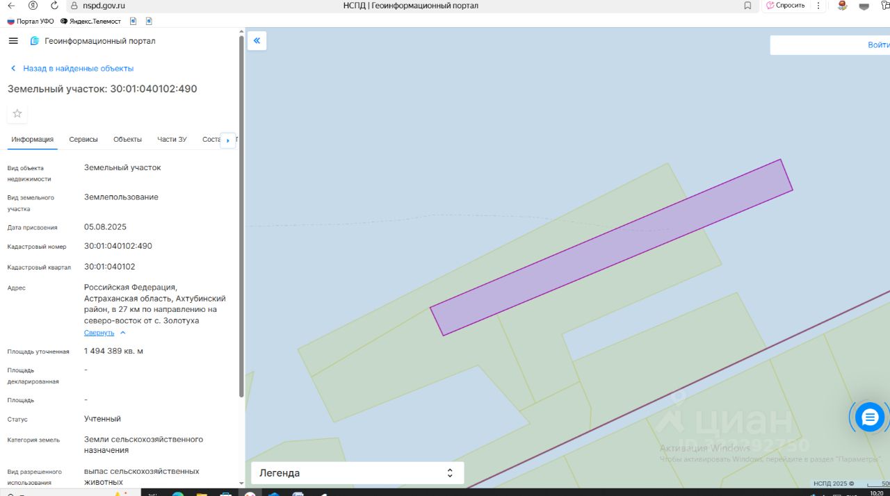 Земельный участок из земель сельскохозяйственного назначения, государственная собственность на которые не разграничена, с кадастровым номером 30:01:040102:490, площадью 1 494 389 кв.м, расположенный по адресному ориентиру: Российская Федерация, Астраханская область, Ахтубинский район, в 27 км по направлению на северо-восток от с. Золотуха, вид разрешенного использование земельного участка выпас сельскохозяйственных животных.