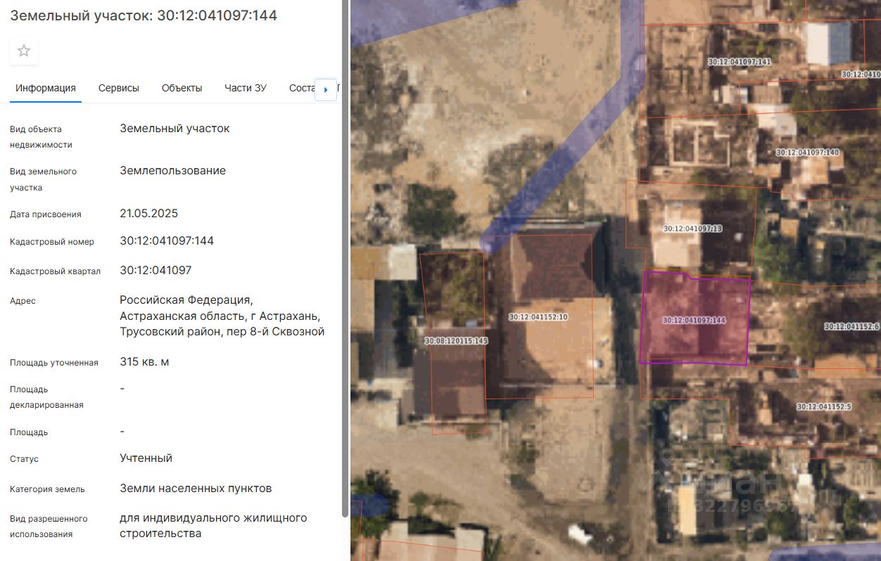 Земельный участок площадью 315 кв.м., расположенный по адресу: Российская Федерация, Астраханская область, г. Астрахань, Трусовский район, пер. 8-й Сквозной с кадастровым номером 30:12:041097:144 с видом разрешенного использования - для индивидуального жилищного строительства