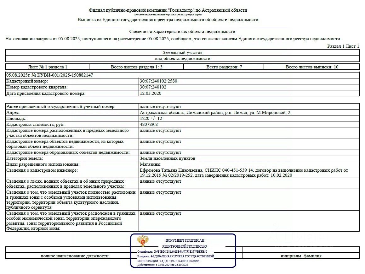 Земельный участок площадью 1220 кв.м., кадастровый номер 30:07:240102:2580