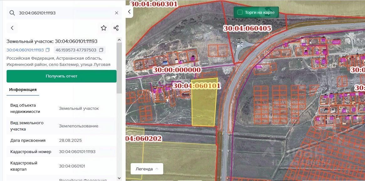 Лот 1: право на заключение договора аренды земельного участка с кадастровым номером 30:04:060101:11193, государственная собственность на который не разграничена, расположенного по адресу: Астраханская область, Икрянинский район, село Бахтемир, улица Луговая, общей площадью 20665 кв.м.