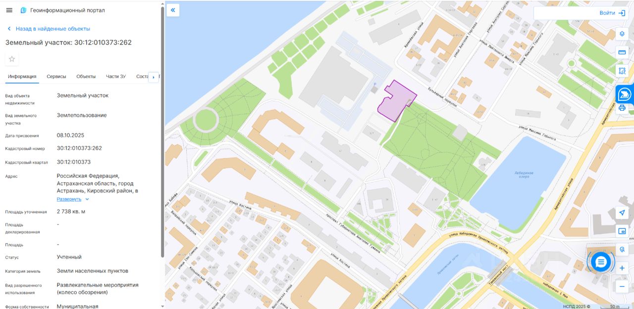 Земельный участок с кадастровым номером 30:12:010373:262 площадь 2738 ,город Астрахань, Кировский район, в границах улиц Энзелийской, Адмиралтейской, Наб. Приволжского затона, Костина, набережной р. Волги, с видом разрешенного использования - "развлекательные мероприятия (колесо обозрения)", без права возведения объектов капитального строительства