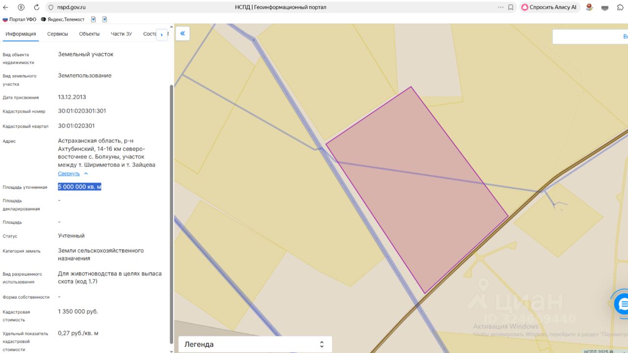 Лот 1 с кадастровым номером 30:01:020301:301, площадью 5 000 000 кв. м, расположенный по адресному ориентиру: Астраханская область, р-н Ахтубинский, 14-16 км северо-восточнее села, вид разрешенного использование земельного участка Для животноводства в целях выпаса скота (код 1.7).