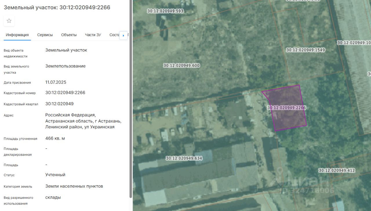 Земельный участок площадью 466 кв.м., расположенный по адресу: Российская Федерация, Астраханская область, г. Астрахань, Ленинский район, ул. Украинская с кадастровым номером 30:12:020949:2266 с видом разрешенного использования - Склады