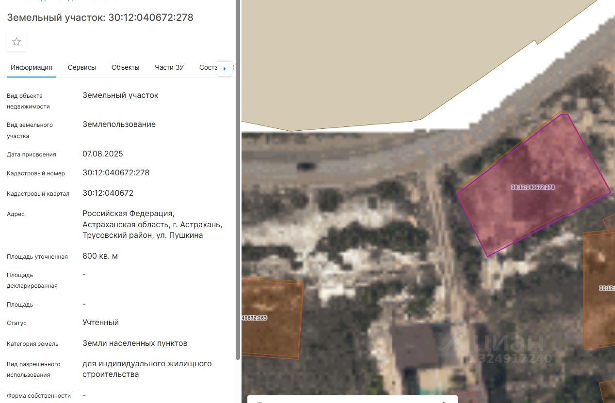 Земельный участок площадью 800 кв.м., расположенный по адресу: Российская Федерация, Астраханская область, г. Астрахань, Трусовский район, ул. Пушкина с кадастровым номером 30:12:040672:278 с видом разрешенного использования - для индивидуального жилищного строительства