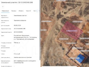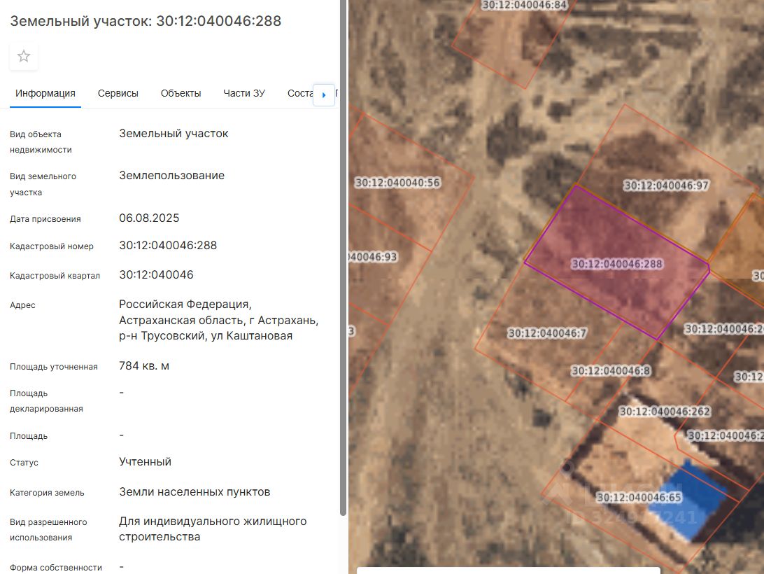 Земельный участок площадью 784 кв.м., расположенный по адресу: Российская Федерация, Астраханская область, г. Астрахань, р-н Трусовский, ул. Каштановая с кадастровым номером 30:12:040046:288 с видом разрешенного использования - для индивидуального жилищного строительства