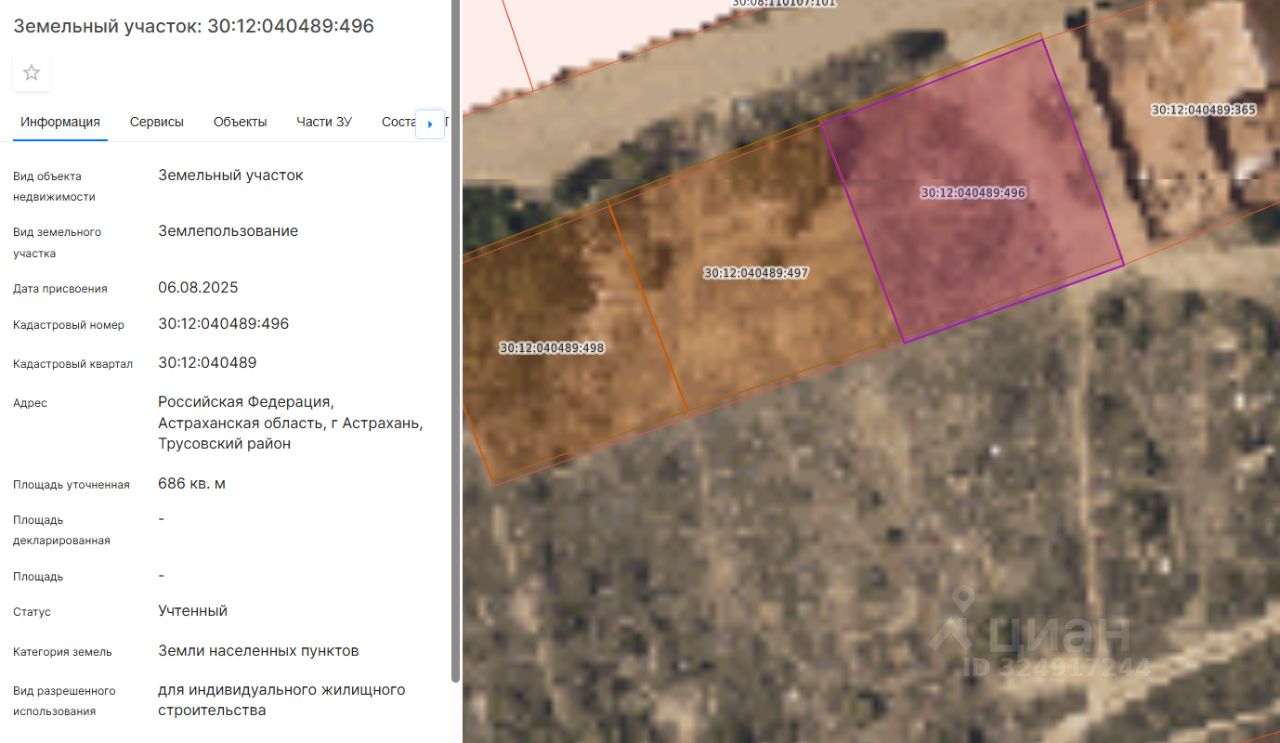 Земельный участок площадью 686 кв.м., расположенный по адресу: Российская Федерация, Астраханская область, г. Астрахань, Трусовский район с кадастровым номером 30:12:040489:496 с видом разрешенного использования - для индивидуального жилищного строительства