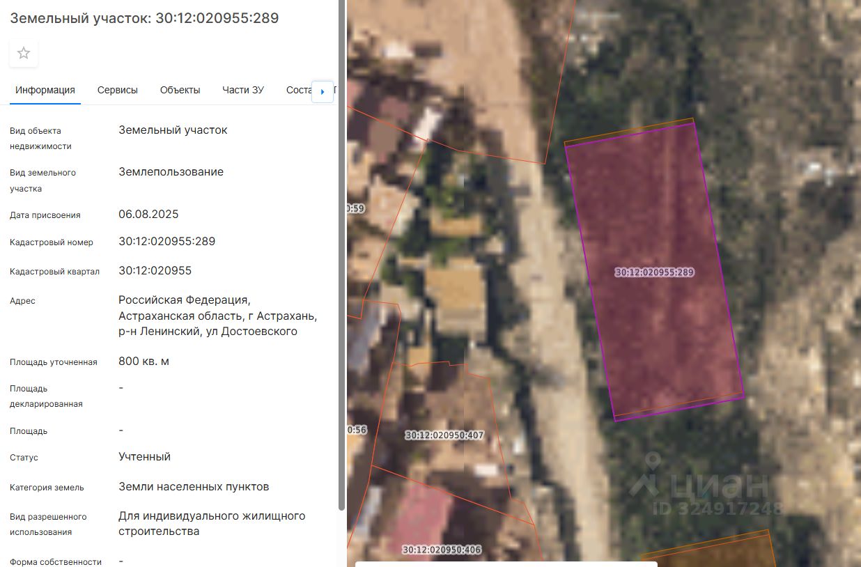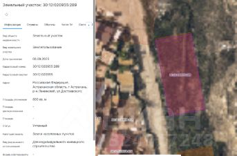 Земельный участок площадью 800 кв.м., расположенный по адресу: Российская Федерация, Астраханская область, г. Астрахань, р-н Ленинский, ул. Достоевского с кадастровым номером 30:12:020955:289 с видом разрешенного использования - для индивидуального жилищного строительства