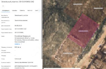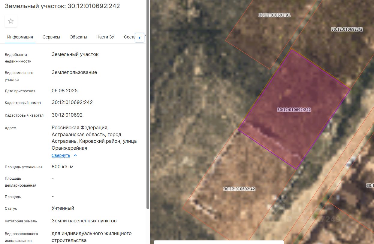 Земельный участок площадью 800 кв.м., расположенный по адресу: Российская Федерация, Астраханская область, город Астрахань, Кировский район, улица Оранжерейная с кадастровым номером 30:12:010692:242 с видом разрешенного использования - для индивидуального жилищного строительства