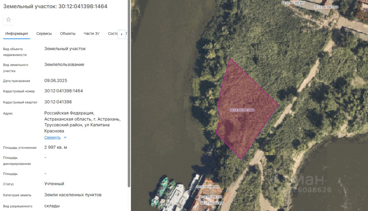 Земельный участок площадью 2997 кв.м., расположенный по адресу: Российская Федерация, Астраханская область, г. Астрахань, Трусовский район, ул Капитана Краснова с кадастровым номером 30:12:041398:1464 с видом разрешенного использования - склады