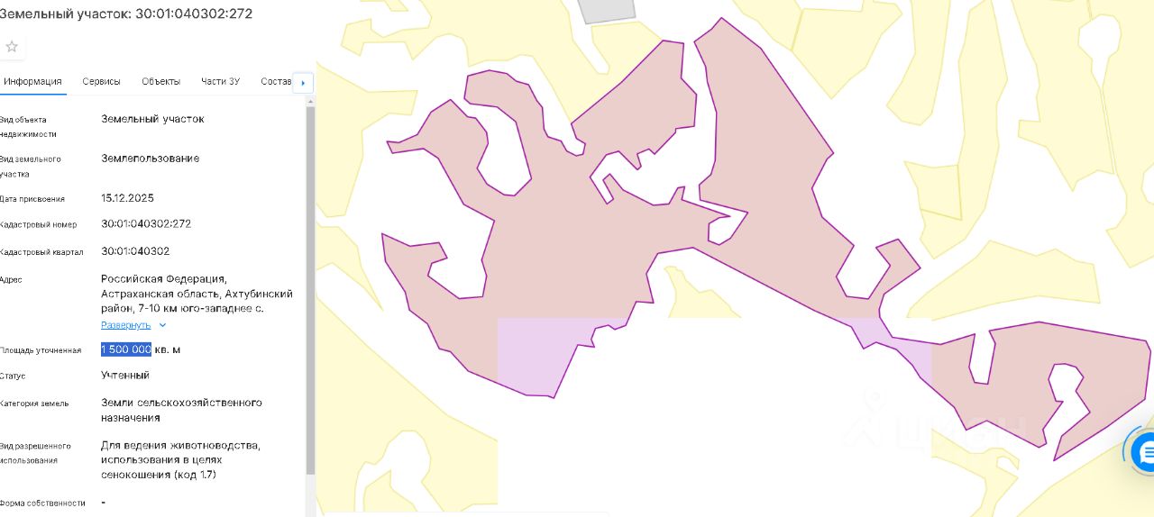 Лот 9 с кадастровым номером 30:01:040302:272, площадью 1 500 000 кв. м, расположенный по адресному ориентиру: Российская Федерация, Астраханская область, Ахтубинский район, 7-10 км юго-западнее с. Золотуха Ахтубинского района Астраханской области, вид разрешенного использование земельного участка Для ведения животноводства, использования в целях сенокошения (код 1.7).