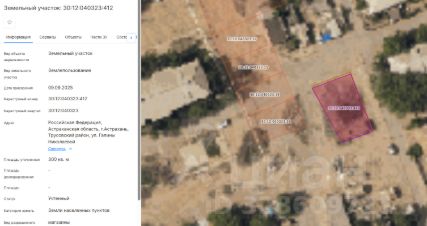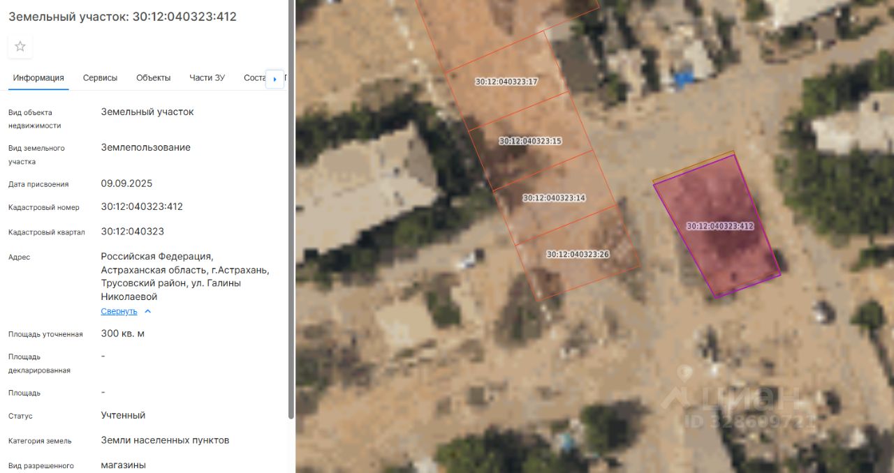 Земельный участок площадью 300 кв.м., расположенный по адресу: Российская Федерация, Астраханская область, г. Астрахань, Трусовский район, ул. Галины Николаевой с кадастровым номером 30:12:040323:412 с видом разрешенного использования - магазины