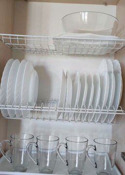 На кухне для любителей готовить,а не покупать еду духовой шкаф, плита, электрический чайник, холодильник, микроволновая печь, турка для любителей кофе с утра и красивая посуда;