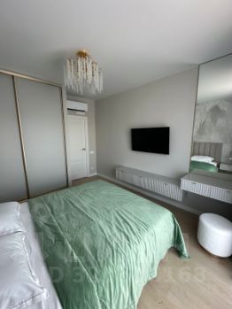 В спальне удобная 2yx спальная кровать с ортопедическим матрасом Аскона. В комнате установлен кондиционер. Есть туалетный столик с большим зеркалом.