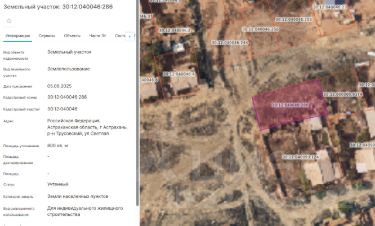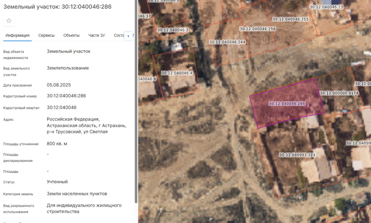 Земельный участок площадью 800 кв.м., расположенный по адресу: Российская Федерация, Астраханская область, г. Астрахань, р-н Трусовский , ул. Светлая с кадастровым номером 30:12:040046:286, с видом разрешенного использования - для индивидуального жилищного строительства