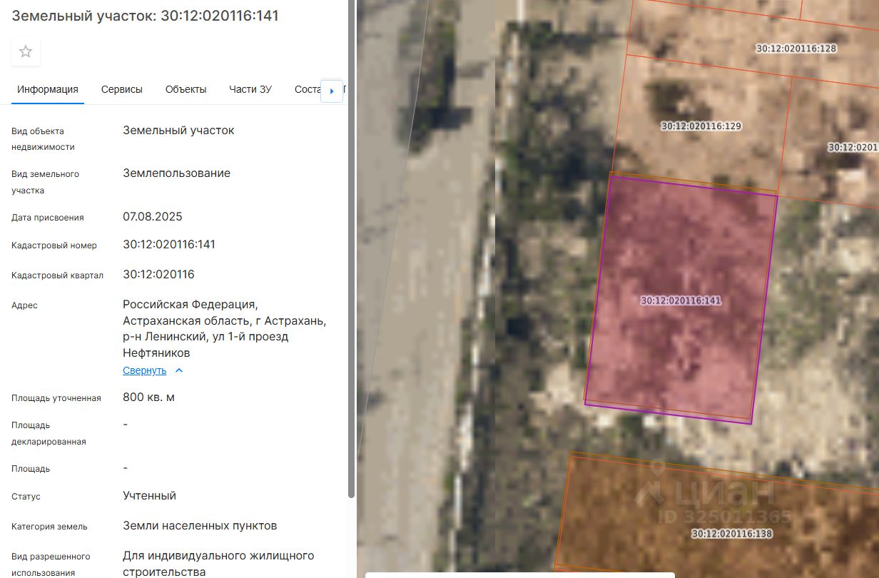 Земельный участок площадью 800 кв.м., расположенный по адресу: Российская Федерация, Астраханская область, г. Астрахань, р-н Ленинский, ул 1-й проезд Нефтяников с кадастровым номером 30:12:020116:141, с видом разрешенного использования - для индивидуального жилищного строительства