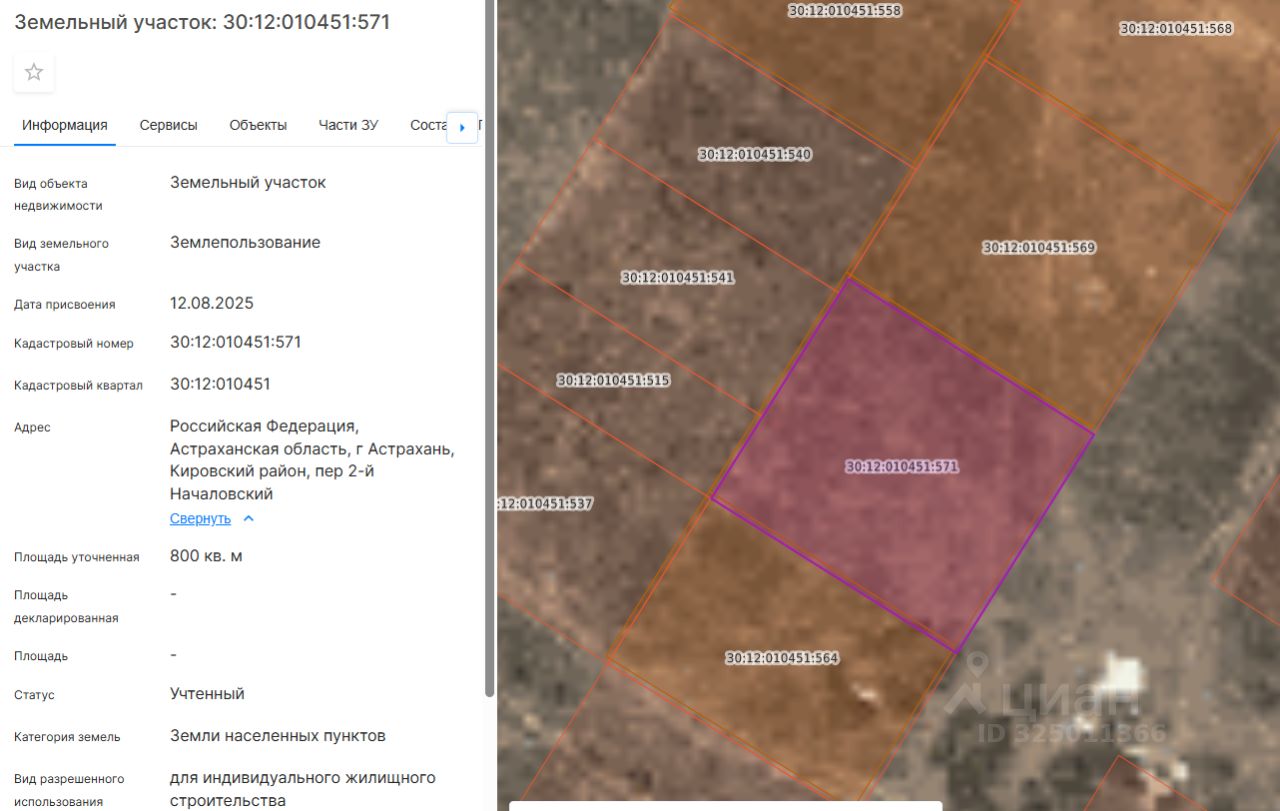 Земельный участок площадью 800 кв.м., расположенный по адресу: Российская Федерация, Астраханская область, г Астрахань, Кировский район, пер. 2-й Началовский с кадастровым номером 30:12:010451:571, с видом разрешенного использования - для индивидуального жилищного строительства