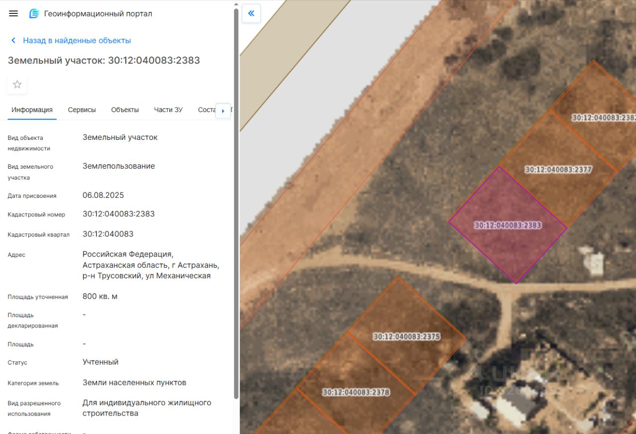 Земельный участок площадью 800 кв.м., расположенный по адресу: Российская Федерация, Астраханская область, г. Астрахань, р-н Трусовский, ул. Механическая с кадастровым номером 30:12:040083:2383, с видом разрешенного использования - для индивидуального жилищного строительства
