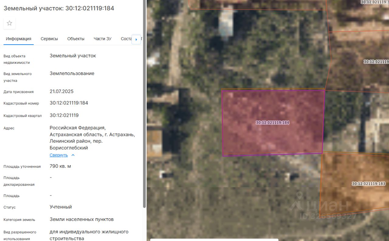 Земельный участок площадью 790 кв.м., расположенный по адресу: Российская Федерация, Астраханская область, г. Астрахань, Ленинский район, пер. Борисоглебский с кадастровым номером 30:12:021119:184, с видом разрешенного использования - для индивидуального жилищного строительства