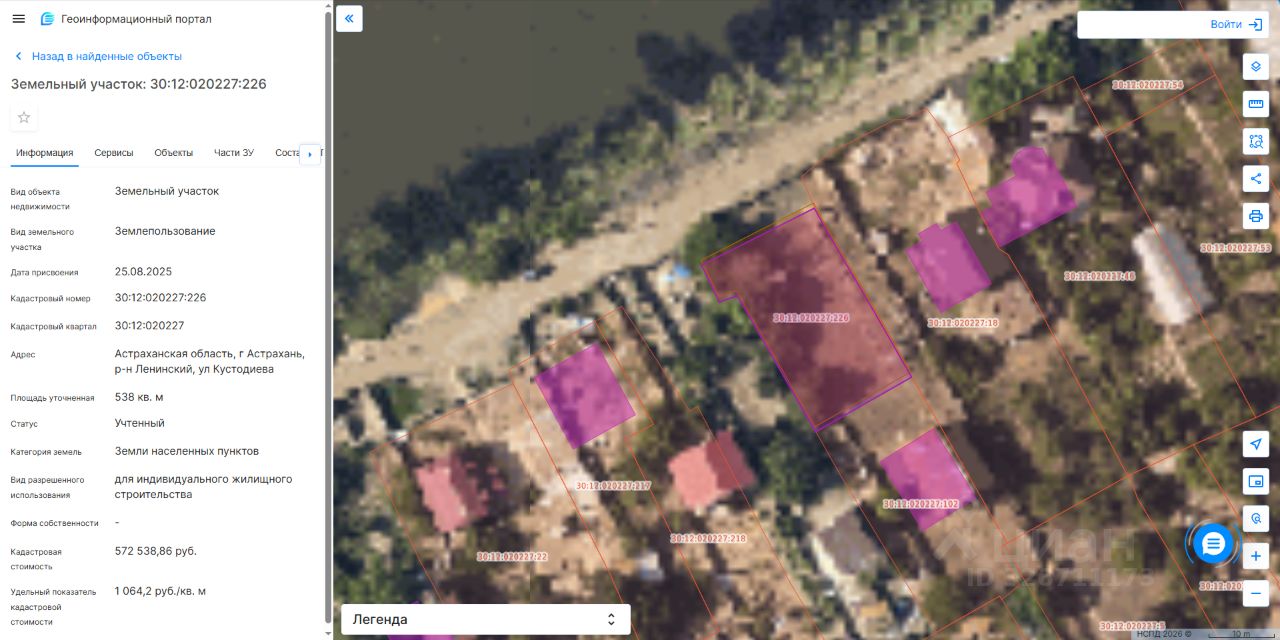 Земельный участок площадью 538 кв.м., расположенный по адресу: Астраханская область, г. Астрахань, р-н Ленинский, ул. Кустодиева с кадастровым номером 30:12:020227:226, с видом разрешенного использования - для индивидуального жилищного строительства