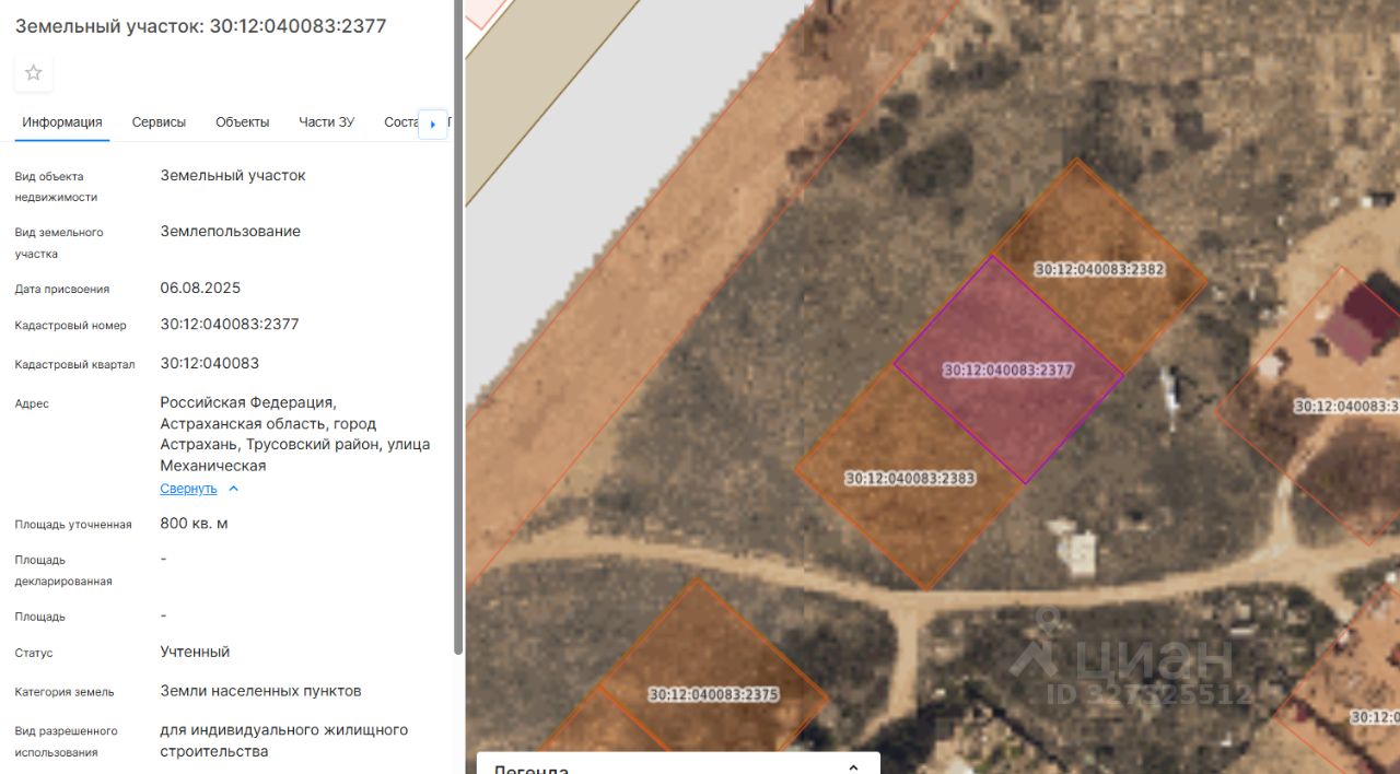 Земельный участок площадью 800 кв.м., расположенный по адресу: Российская Федерация, Астраханская область, город Астрахань, Трусовский район, улица Механическая с кадастровым номером 30:12:040083:2377, с видом разрешенного использования - для индивидуального жилищного строительства