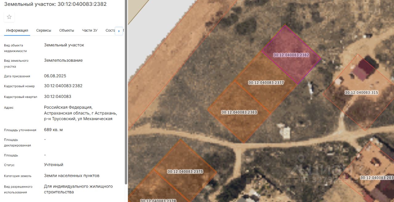 Земельный участок площадью 689 кв.м., расположенный по адресу: Российская Федерация, Астраханская область, г. Астрахань, р-н Трусовский , ул. Механическая с кадастровым номером 30:12:040083:2382, с видом разрешенного использования - для индивидуального жилищного строительства