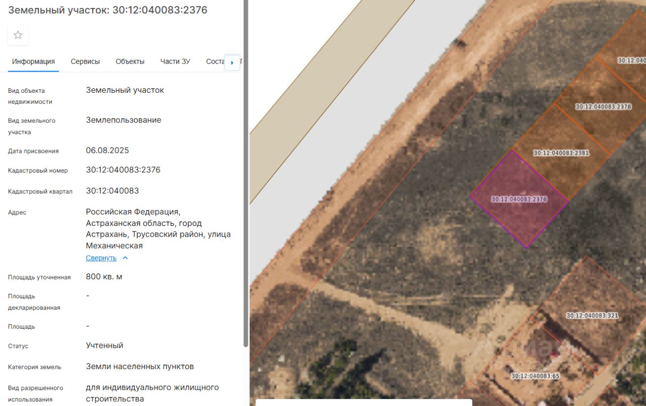 Земельный участок площадью 800 кв.м., расположенный по адресу: Российская Федерация, Астраханская область, город Астрахань, Трусовский район, улица Механическая с кадастровым номером 30:12:040083:2376, с видом разрешенного использования - для индивидуального жилищного строительства