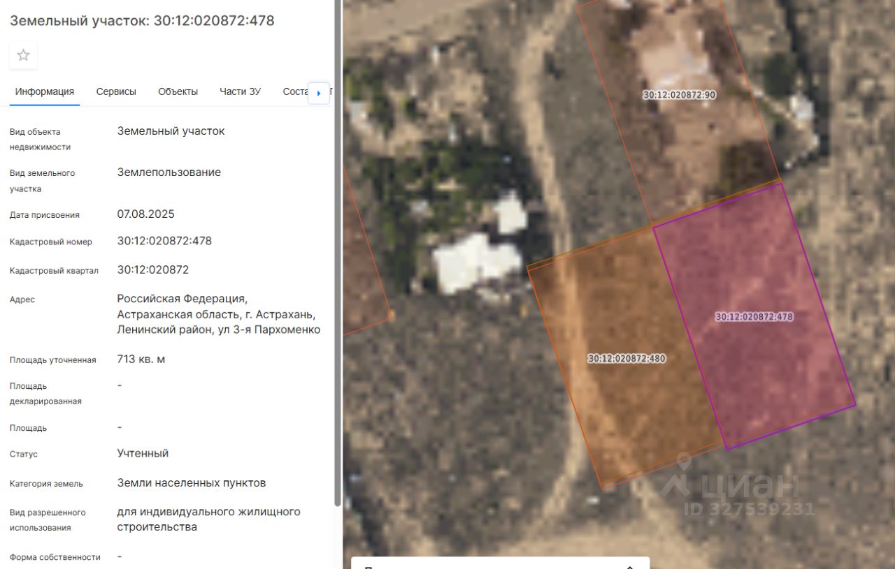 Земельный участок площадью 713 кв.м., расположенный по адресу: Российская Федерация, Астраханская область, г. Астрахань, Ленинский район, ул 3-я Пархоменко с кадастровым номером 30:12:020872:478, с видом разрешенного использования - для индивидуального жилищного строительства