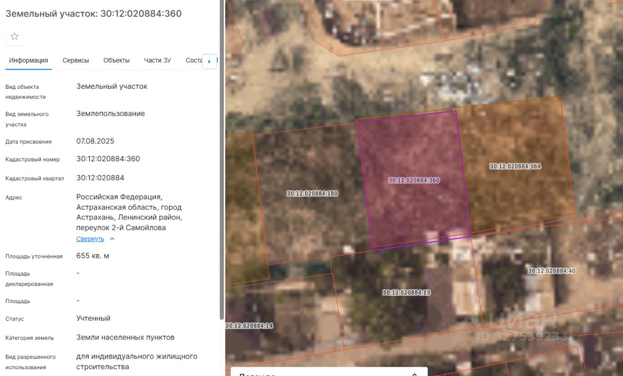 Земельный участок площадью 655 кв.м., расположенный по адресу: Российская Федерация, Астраханская область, город Астрахань, Ленинский район, переулок 2-й Самойлова с кадастровым номером 30:12:020884:360, с видом разрешенного использования - для индивидуального жилищного строительства