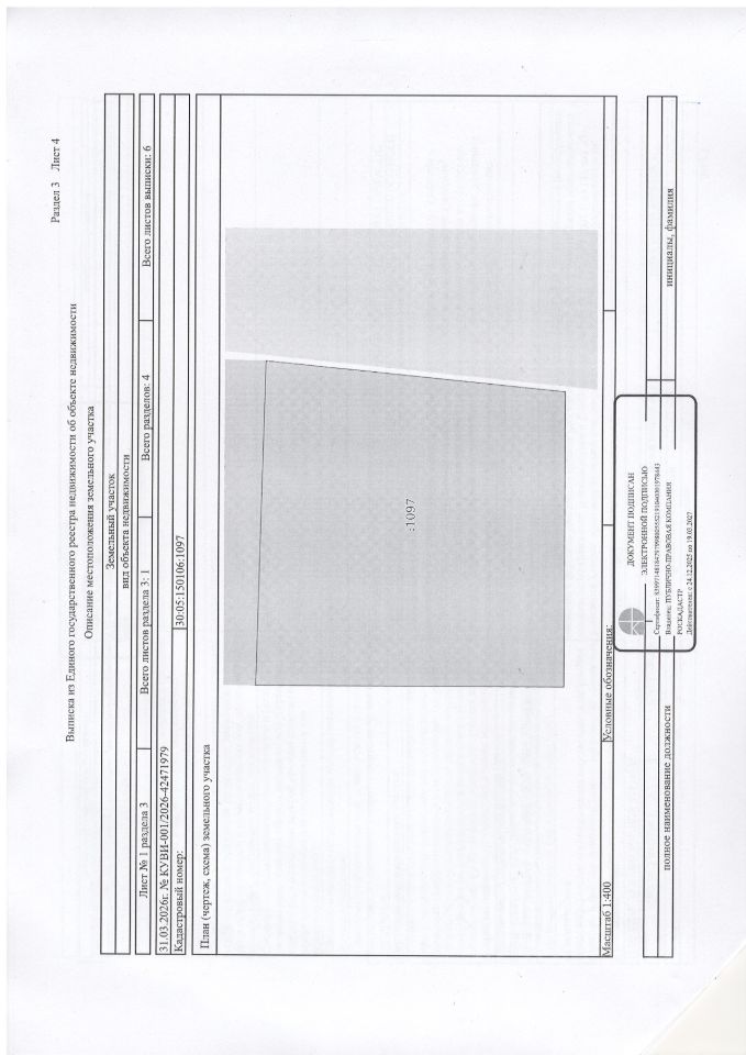 Земельный участок с кадастровым номером 30:05:150106:1097 площадь 1425 кв.м по адресу Российская Федерация, Астраханская область, Камызякский муниципальный район, сельское поселение Образцово-Травинский сельсовет, с. Гандурино, ул. Молодежная, з/у 28