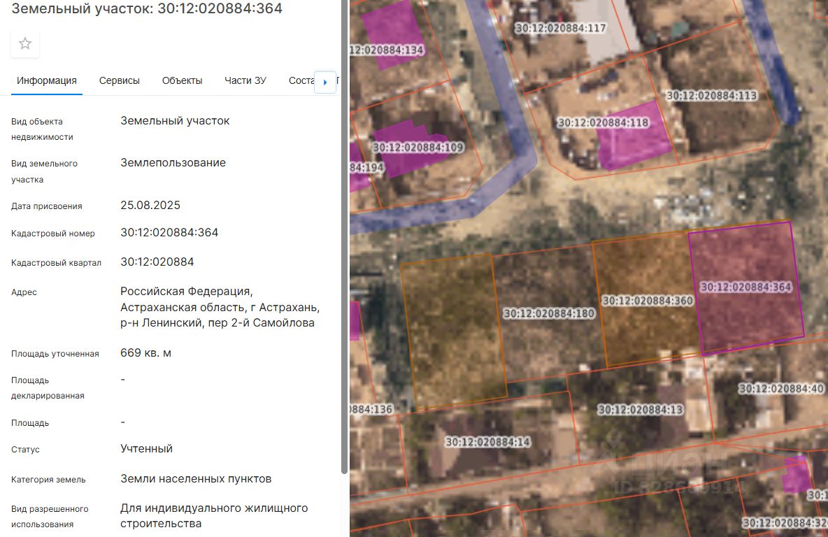 Земельный участок площадью 669 кв.м., расположенный по адресу: Российская Федерация, Астраханская область, г. Астрахань, р-н Ленинский, пер. 2-й Самойлова с кадастровым номером 30:12:020884:364, с видом разрешенного использования - для индивидуального жилищного строительства